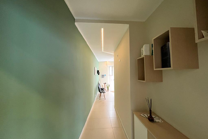 Per le pareti la scelta è ricaduta sul verde, che ha una forte corrispondenza emotiva per la sicurezza e l'equilibrio, mentre per il mobilio, superfici in legno di rovere per conferire leggerezza e resistenza. Grande attenzione è stata data alla riservatezza del cliente, infatti, l’ingresso principale è stato traslato nella parte posteriore.